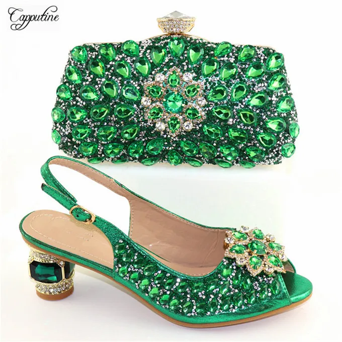 Big Deal Popular green with shinning stones high heel pump shoes and clutch bag sets for party CR171 heel he